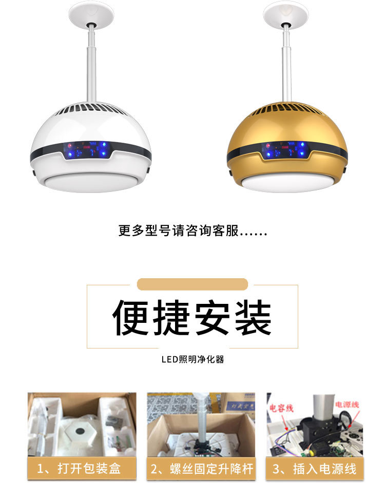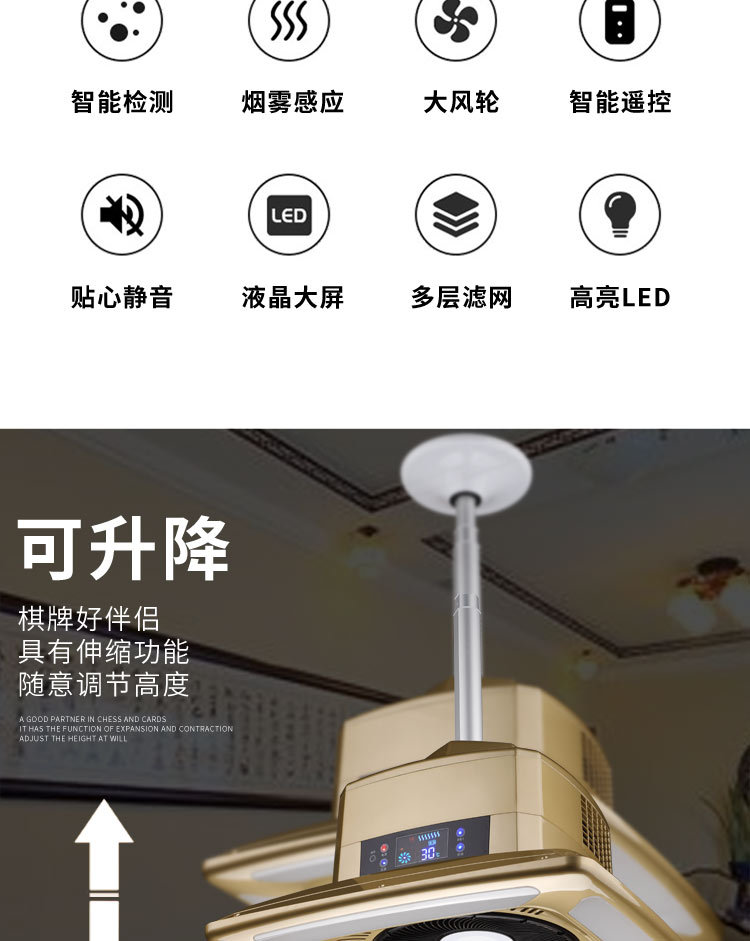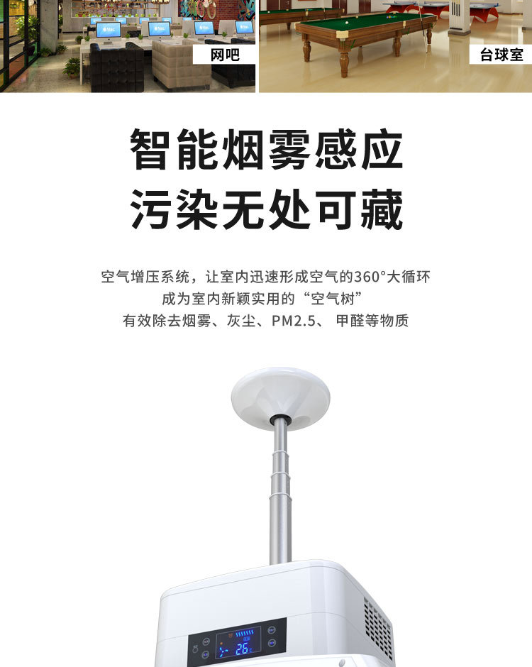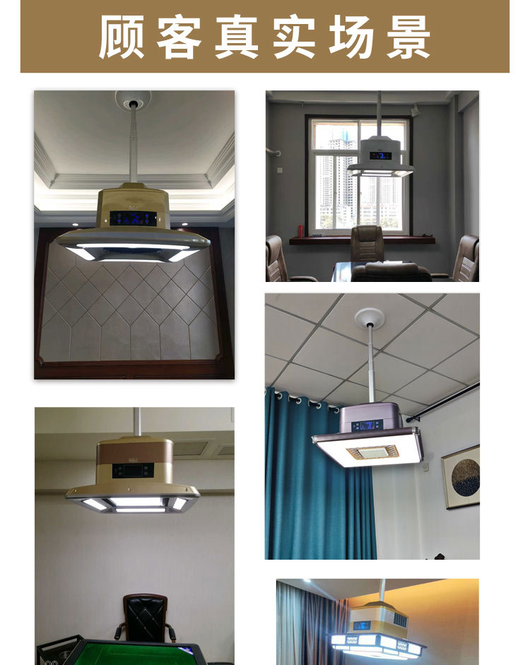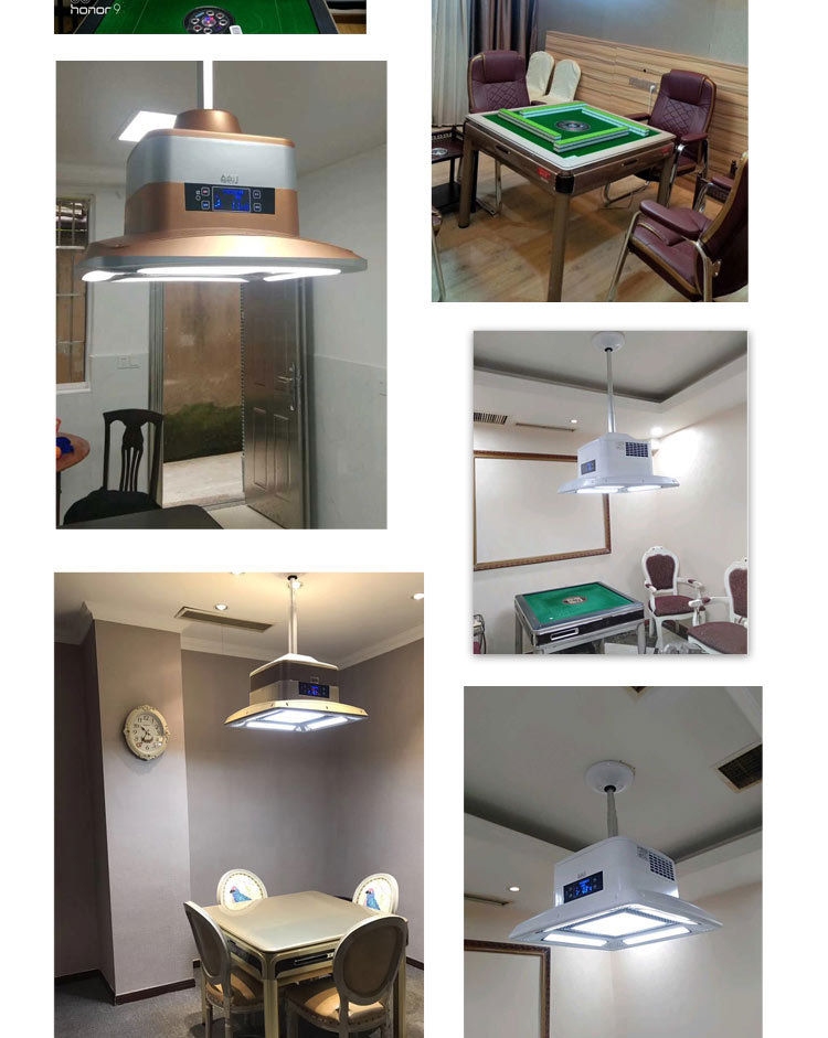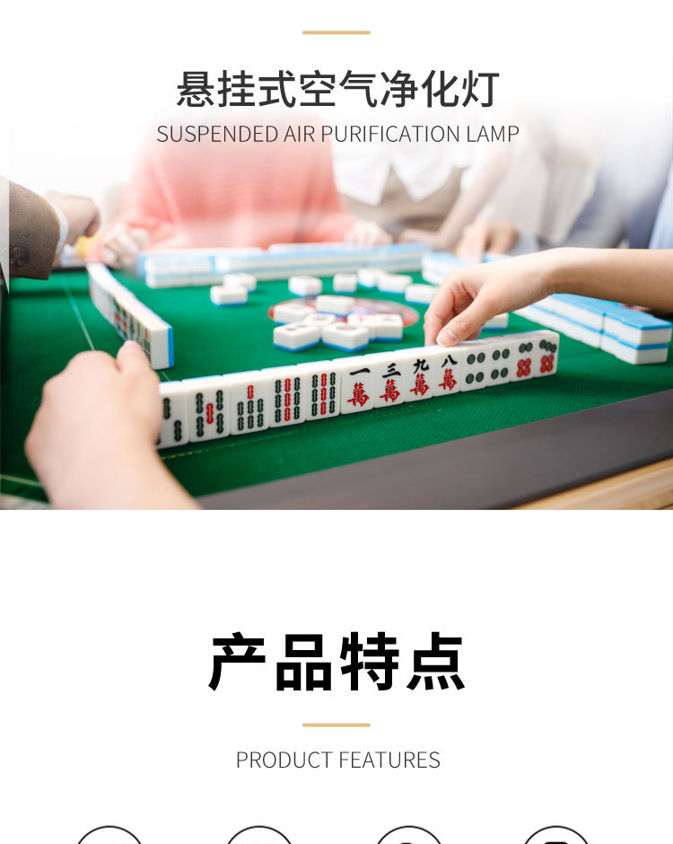 麻將館、棋牌室適用,能有效地消除室內空氣中的煙塵、煙霧(有效地預防“二手煙”對人身體的危害)及室內裝修產生的有害氣體。集空氣凈化、照明、裝飾于一體。